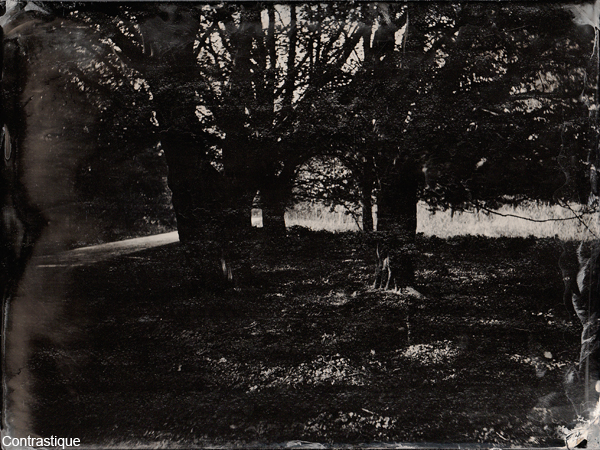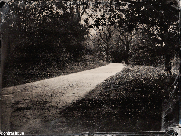 My second attempt at outdoor photographing on Collodion. This one was not as successful as the last one but a good learning process nonetheless. It turns out I have a light leak in my back where the slide slides in. You’ll see a fog coming from the left which is caused by this. The weather was qua lighting a bit unpredictable. the sun came and went at the flip of a dime. A bit hazy too so the harsh shadows which I was expecting and, even worse, hoping for didn’t turn up. The last plate I did was pretty good, capturing a nice contrast on some rotten trees but I managed to wipe the image off when all I had to do really was the fog with my cotton ball. Anyway, that’s a part of it and it’s cool 😉