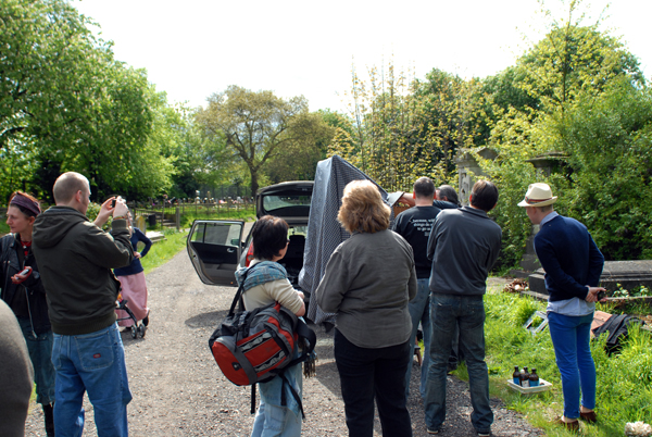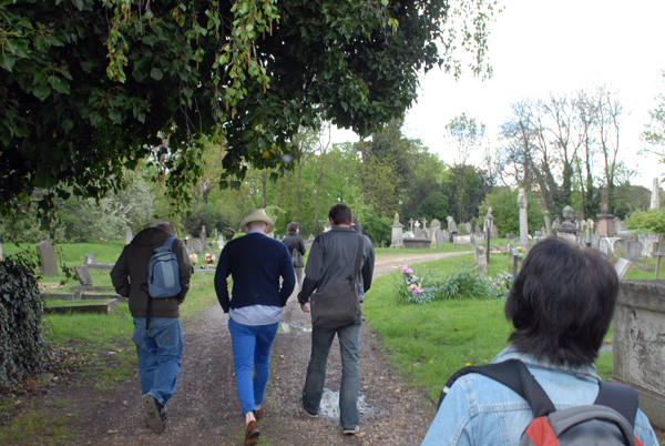 The train ride was very nice and quick, only pressure building up in our ears going in and out of tunnels which was not that nice but before we knew it we were in London. There began the last bit of the journey to Kensal Green by metro. Very easy to find and at around 12:15 we finally did arrive at the place we had to be at. But the cemetery turned out to be quite a challenge in finding the exact spot of the event; it was so big! 70 acres of graves is massive and we got lost. I finally called Quinn to see where they were and after a bit of help we finally walked down the lane which took us to the exhibition and event part.