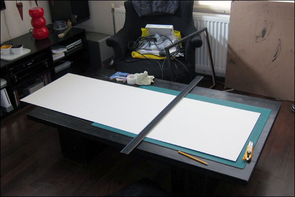 Recently I bought a mat cutter so I can do the framing myself. The system is really simple, even for someone who never really tried it and is rather clumsy. I bought large sheets of matting paper: 100 x 150 m. which I cut up to pieces of 50 x 50 cm. The best looking ones I took, measured the dimensions of the photograph, added 1 cm to each side as I wanted a tiny white border visible around the photograph and drew the dimensions on the back of the mat.