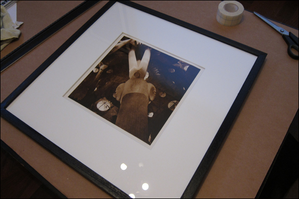 The way I mount is that I have another mat ready, 50×50 without a hole, and use it to attach the photo to. I use small double adhesive tape by Henzo and only attach it at the top of the paper. I printed the photo on 30×40 paper and the image itself is only 26×26 so I have a good white border to work with. I only place the tape where the white border is, not where the actual image is. That way you will never damage your photo, whether it’s due degradation of the glue in time or when you want to take it out of the mat one day. The two mats are taped together using acid-free tape and you flip the previously cut mat over the one where you attached the photo to and voilá; frame it and look at it full of joy 🙂