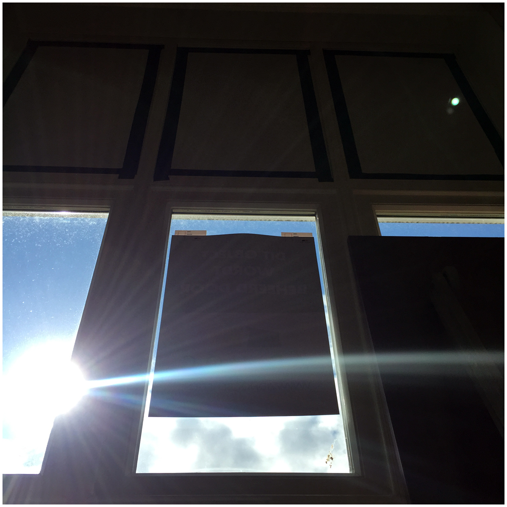 Today we finished making the space light tight with some great fabric, donated by Erik which he bought quite a few years back for a whole different purpose. My first plan was to use something like black rubble sacks, double-layered, and tape it to the windows (which were quite a few!). But this is much much better as only one layer is sufficient to get the job done and it’s white so reflects all red light inside and reflects light, thus heat, outside. Anyway, enough with the blabla…onto some images, from start to where it’s at now 🙂