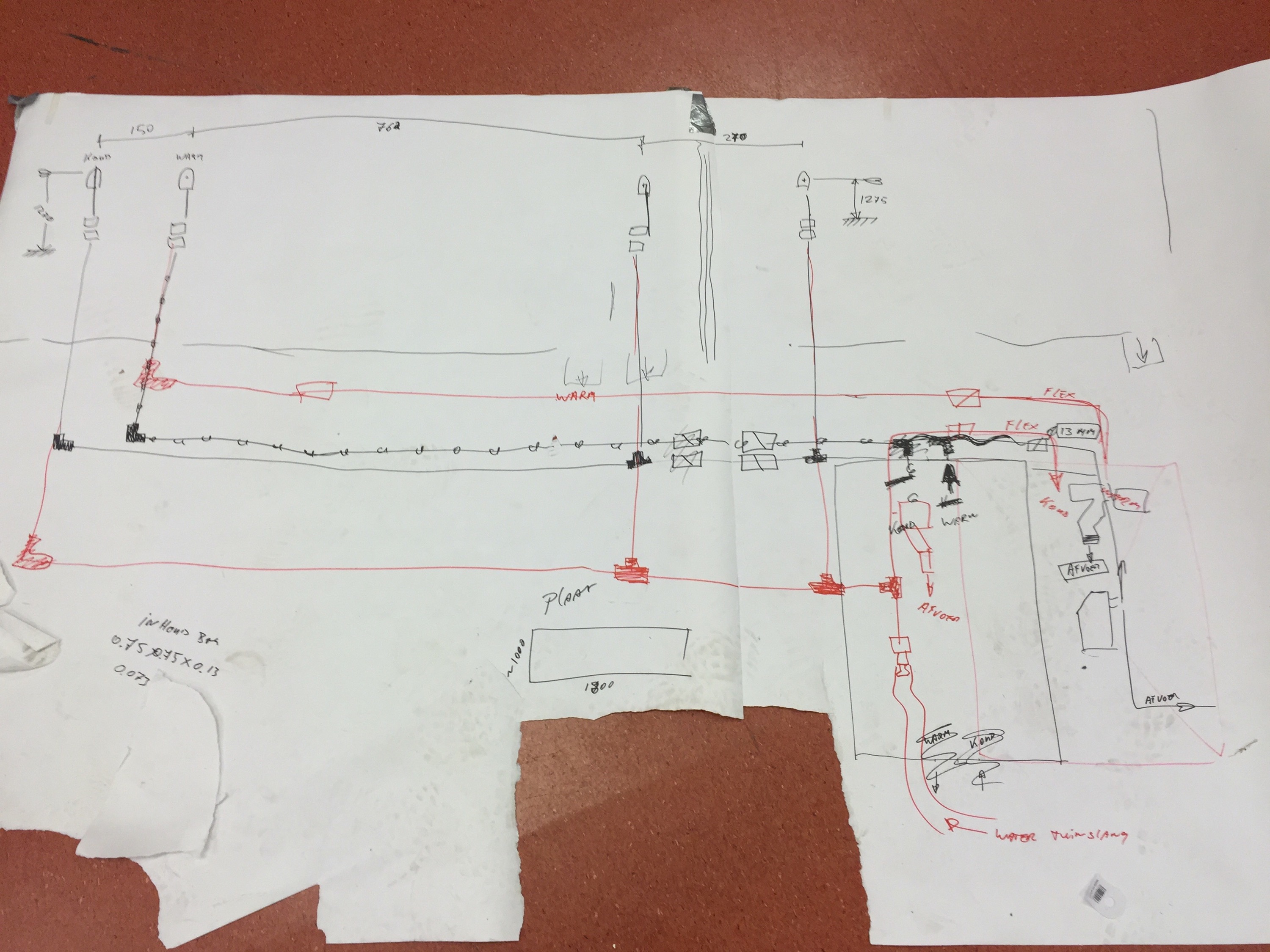 He made a life-size drawing on how the piping needed to be done with the exact measurements and then we started building. The drawing made it so clear that even I could understand it perfectly. Everything was built using compression fittings so if ever, for whatever reason, this thing has to be disarmed and put back again, it’s easily possible. Comforting thought 🙂