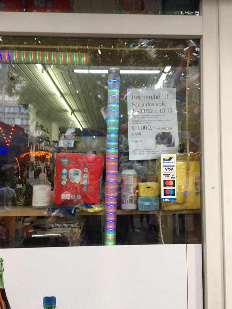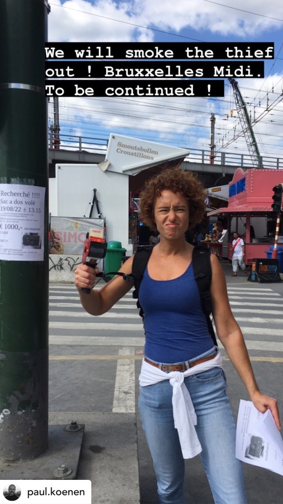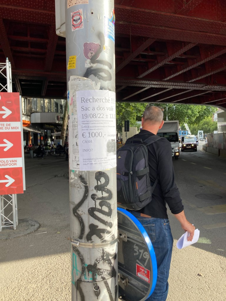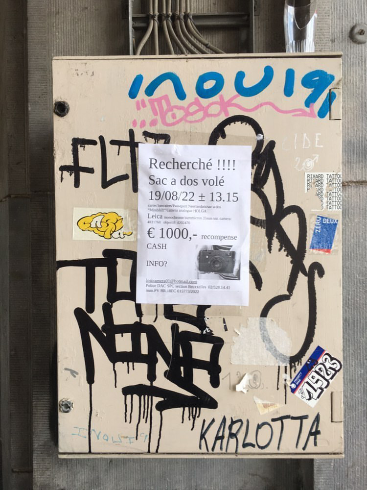 We went back there today. Last night I wrote to every camera and second hand shop in Brussels to mention the goods stolen. Maybe we get lucky. And we printed rewards on A4 sheets for anyone giving me back this camera. We went back today to spam the area with these A4’s and glued them onto everything that would hold them. Around the bar they seemed to get pretty nervous when they saw us today with these sheets, asking questions and responding very awkward. Tomorrow we are heading back again, keeping the pressure on whatever, hoping something will happen. Fingers crossed. My insurance is not going to cover this damage in its entirety. I will not be able to buy this again so… the thieves are not the only desperate ones right now…